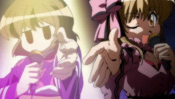 The two who serve as main vocalists for the 2nd opening Roulette☆Roulette are Ichijou and Kurumi. Therefore both of them started their live performance inside the bus! Spotlight illuminates upon Ichijou, but it doesn’t reach Kurumi, which is often the case. After all, it can’t be helped that she’s plain.