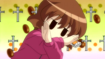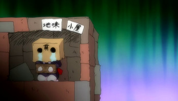 The reaction Kurumi makes after receiving harsh words from Rei, is putting a paper bag with “moe” written on it over her head. In the manga Maromayu as well, Kurumi is forced to wear this paper bag.