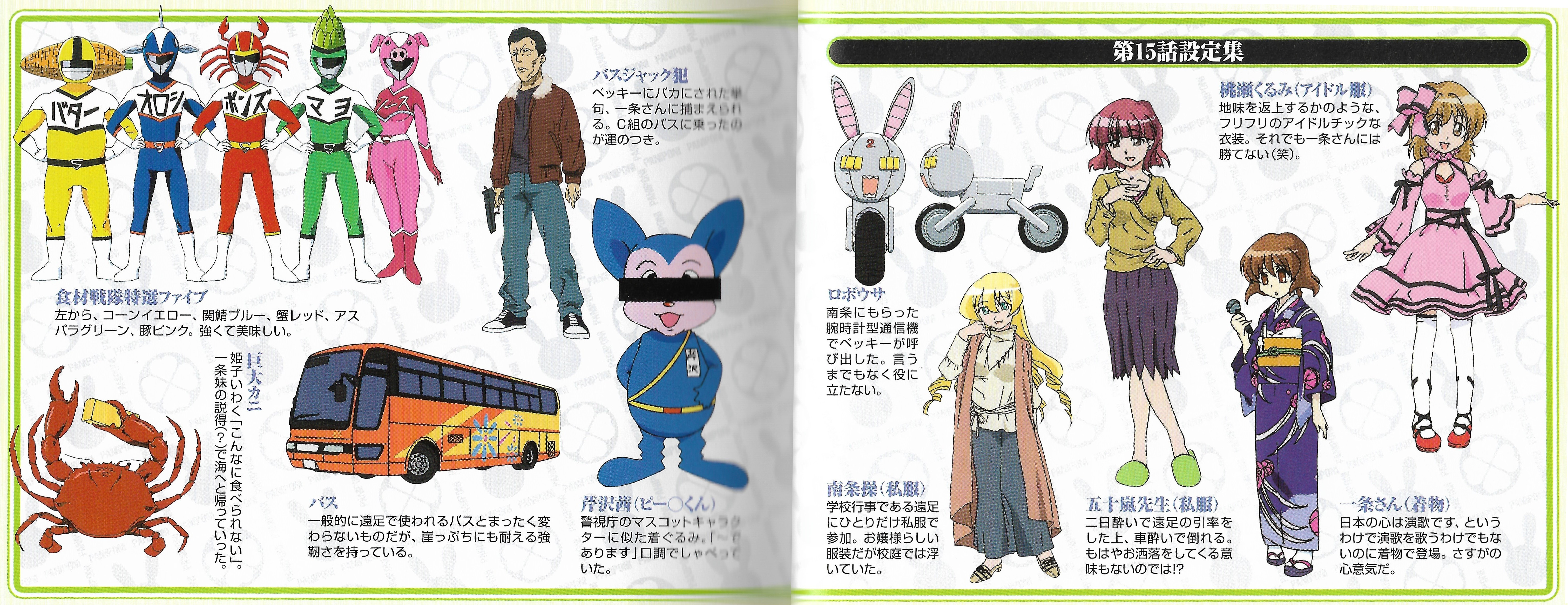 The side story here was Miyako with her English word flashcards. Searching words online didn’t work for me, so I ended up going to a book store and buying several Japanese-English dictionaries. For C part, where Food Rangers! Specially Selected Five! appears again, I created them background information, character profiles, backstories, relationships, special skills and weak points, which I submitted to the Director. Even though we aren’t going to use that stuff at all (laughs).