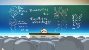 We Told You It Was About Going Forward!  Perhaps included to imply the series will still continue in DVD releases, the TV version had “It’s not over yet!” (まだ終わらんよ!) written here, which was a blackboard message by Series Director Shin Oonuma-san. Having finished the work after completing the Final DVD volume, it has been changed to a famous message from a certain adult game. Were the staff members burned out?