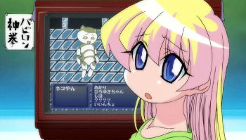 9. Life-or-Death Fight With Dancing Dolls? Becky is playing a famous RPG. Her party members had the names of characters from a romance game that got an anime adaptation. Afterwards when this screen appeared once again, it had the character names of a different romance game.