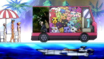 14. NEW WEAPON Himeko playing with a Gunzal, and a plug **it-styled doll. After her line “I prepared some new weapons~”, weapons with the same style as Gol*ion Hammer and E*calibolg can be seen.