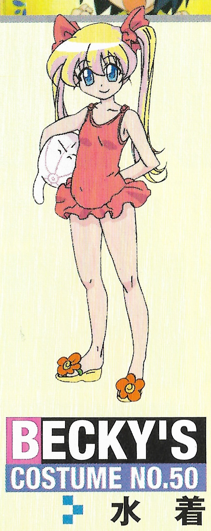 Surprisingly (?) her swimsuit has a cutesy design.